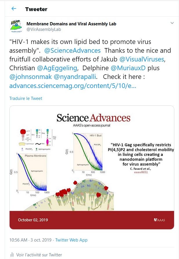 We finally quantified this phenomenon in viral host cells (HIV-1-infected or Gag-transfected CD4 T cells) by measuring the diffusional changes of lipids (PIP2, Cholesterol, SM and PE) into and out of the viral bud on the T cell surface by sSTED-FCS (Scanning STED FCS), in collaboration with C. Eggeling (U. Oxford/ Univ Jena, UK-Germany) and J Chojnacki (U. Oxford/ IRSI Caixa, Barcelona, SP) (Favard et al., 2019).